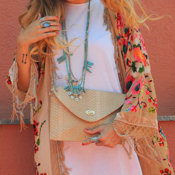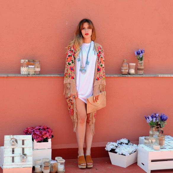 I chose an- oversized cotton t-shirt worn as a dress, and esparto wedges, though I always end up dancing barefoot ;) For moments of cold a floral print kimono, and matching the tones of this garment, which combines a romantic and vintage feel, a BISSÚ clutch and watermelon color lips. The plan: a party in a whip with friends and new people.