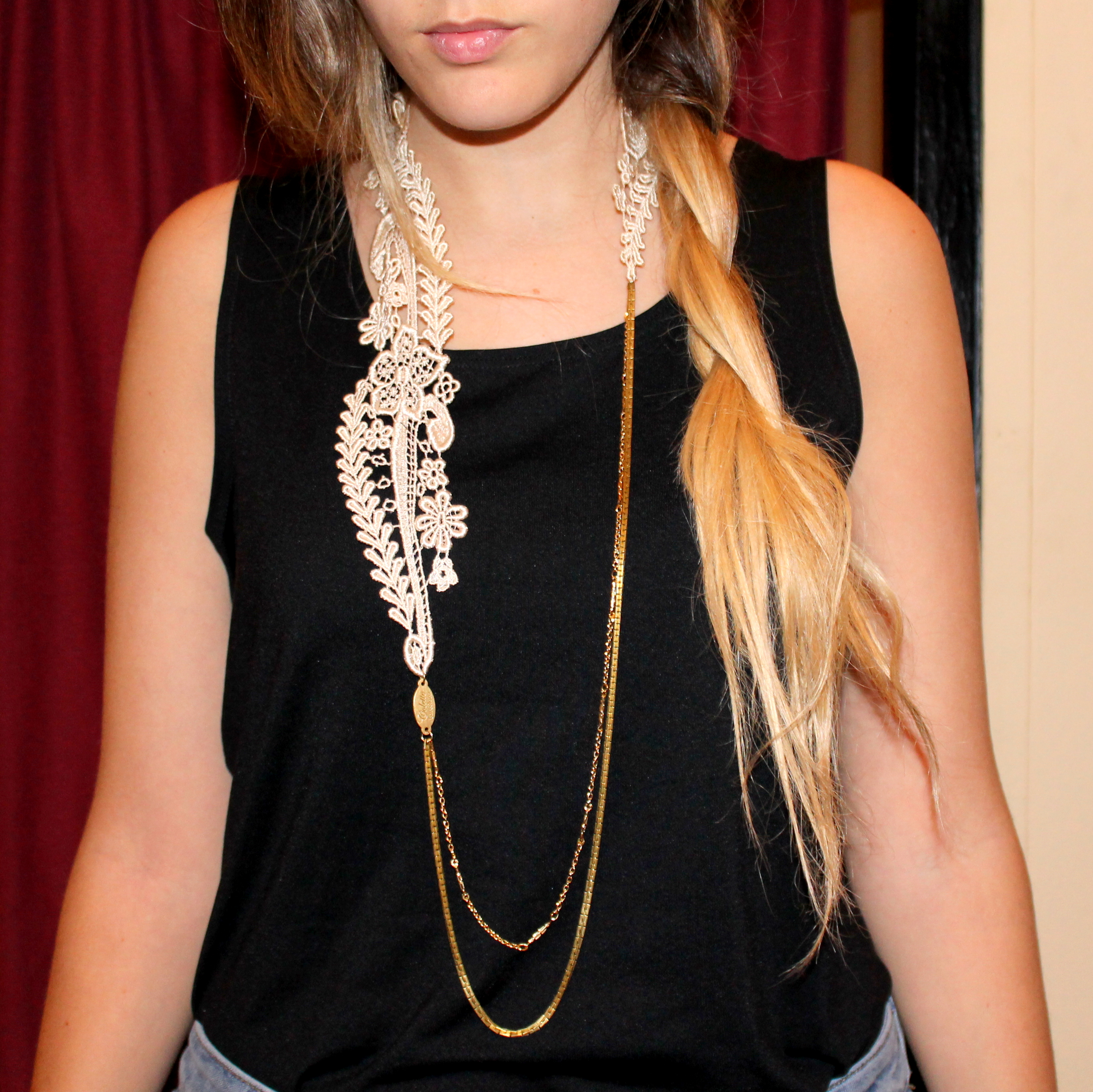 It’s all about unique accessories, although we could call them little artworks. They are completely handmade, a craft product where the whole entire creation process has been done by Susana. She chooses different lace pieces that she rescues from a lot of places all over the world. She works with high quality lace, and vintage, where every single piece she creates has a unique story. She tries with lace and dyes, chains or brooches. She mixes the lace with little chains to create long or shorts necklaces, or puts some pieces together to get a shirt collar which gives a distinct and original air to your shirts. Besides the bracelets or crowns you can find, there is also a small space where you can find some clothes (vintage as well) that she have chosen personally.
