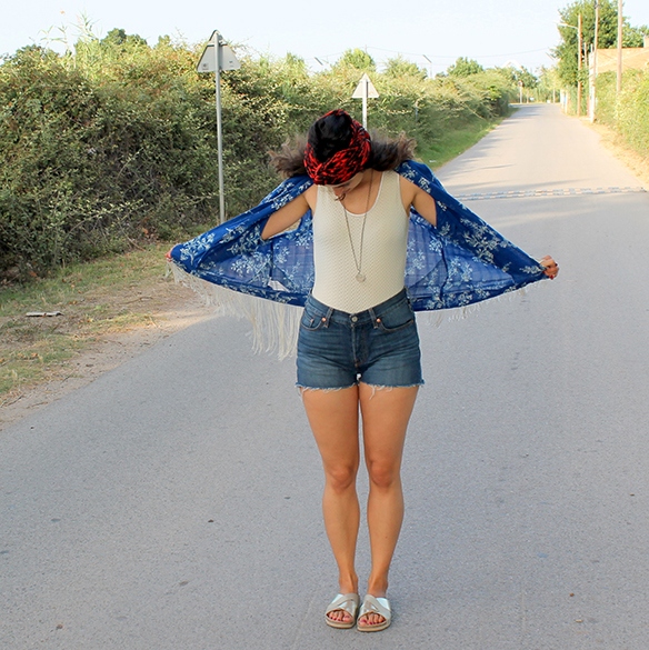 Per a donar-li protagonisme vaig decidir utilitzar dos bàsics, que en cas de dubte, mai fallen. Shorts texans i body blanc. Per a contrarestar i afegir una mica més de color, vaig escollir aquest turbant en tonalitats vermelles i negres que, a més, fa una combinació perfecte seguint una de les tendències d’aquest darrer any, el mix and match. Us agrada?