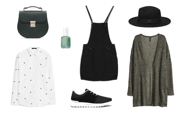 On Sunday we opt for a black pinafore and we match it with khaki. We choose a white shirt with print of that color, a knit cardigan and a bag of the same tone. At the feet trainers in B&W and as an accessory a hat, now that it starts cooling we fancy this kind of accessories. Happy Sunday!