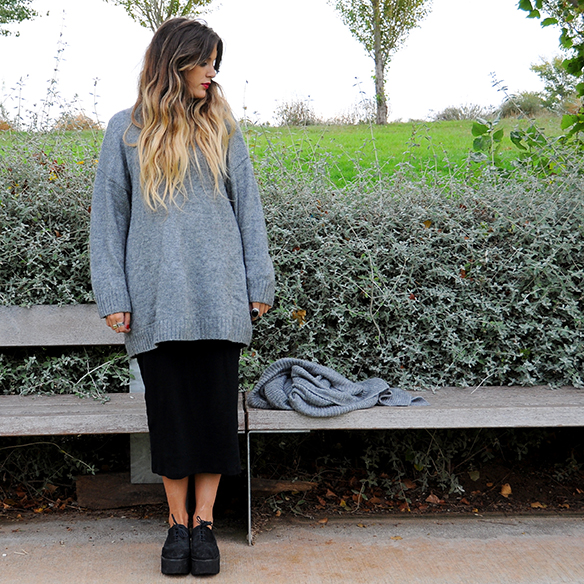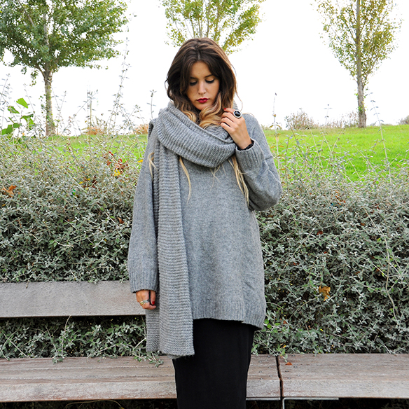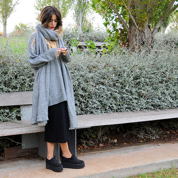 There are days when you fancy a comfy look like this one: cotton midi skirt, oversized jumper and a huge scarf to wrap up and keep warm. I like the different looks that are simple and have nothing but have everything, and if they are in grey and black for Winter, more.