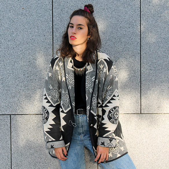 Hi han peces que t’enamoren només creuar-se en el teu camí. Hi han peces que saps que seran teves. I és aquest el cas de la jaqueta de segona mà que porto. La vaig veure i només vaig poder dir «Sí, vull!». Mentre anava pensant en les històries que amagava aquella peça i les històries de les que jo la faria partícip: és l’encant de la roba de segona mà. S’ha convertit en la perfecta aliada per a aquesta tardor. Amenitza qualsevol outfit i li dona un gir al binomi B&W.