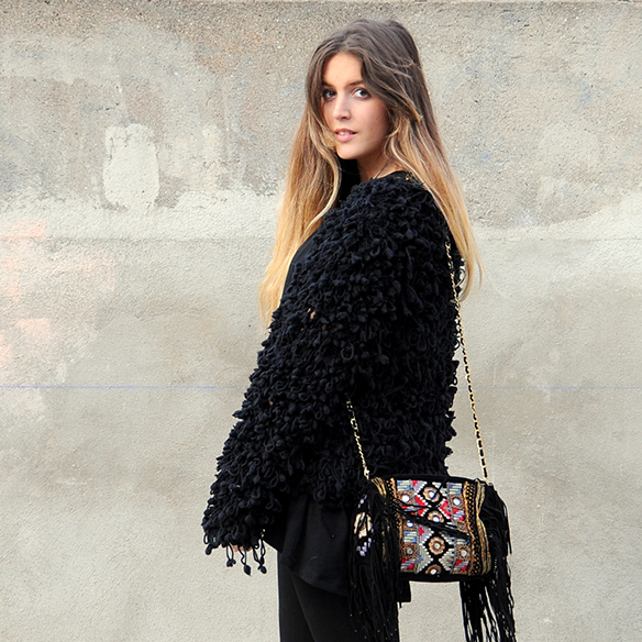 I have always been a lot of «all to black» and, in Winter more. I can’t help but to love it! I’ve had that weakness always of noticing different and daring jackets. If we join both factors I get today’s outfit: a total black where the star is the frayed jacket, shared with the brocade purse.
