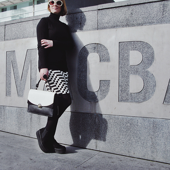 Y mientras voy jugando con ambos colores, le doy el toque urbanita con pendientes asimétricos -probádlos, ¡os encantarán!-. Y así, en el MACBA, rindo homenaje al arte contemporáneo y al barrio de El Raval. ¡Mi querida Barcelona, qué suerte tenemos de tenerte!