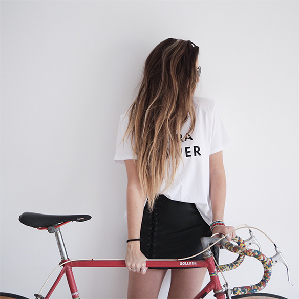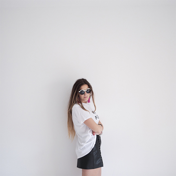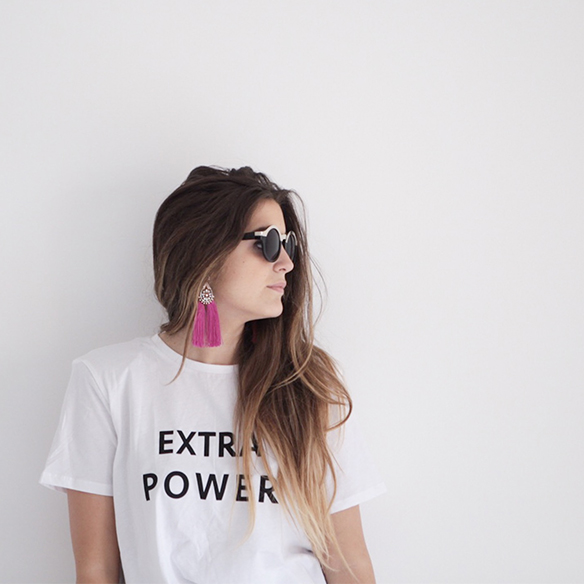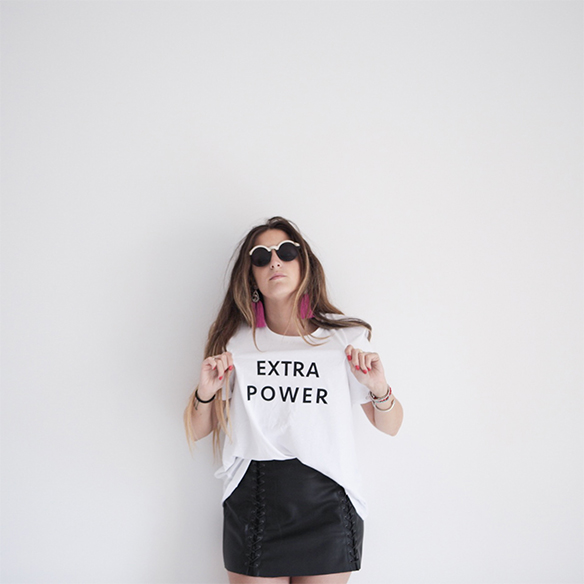 Una faldilla leather i arrecades fúcsies acompanyen a la protagonista de l’outfit d’avui, la samarreta amb el missatge Extra power, per als dies d’ànims baixos. No oblidem que hem de mimar-nos i estimar-nos a nosaltres mateixos, i de vegades ens toca auto pujar-nos l’ànim. Així que: Extra power al màxim!!! Un look sporty, tot un must una temporada més per començar la primavera…