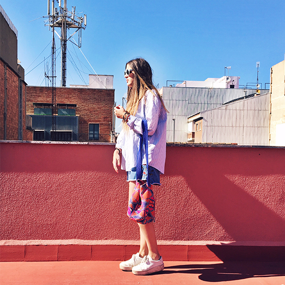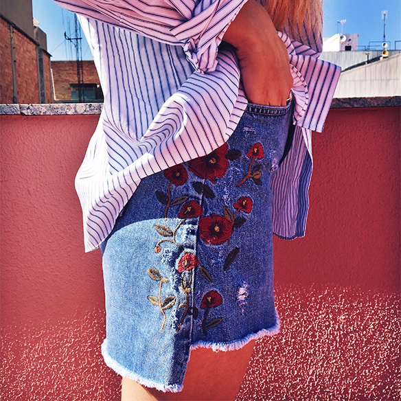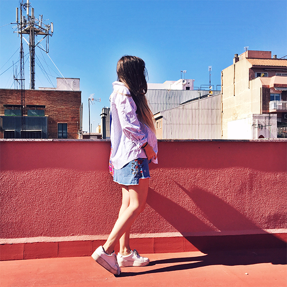 Gaudir d’un diumenge al sol entre amics al so d’una BBQ al terrat és el millor pla per acabar el weekend… Sent valenta (almenys una estoneta) m’acomiado de les mitges i combino la mini amb flors bordades amb el print a ratlles de la camisa, un mix & match que acabo amb les sunnies blau bebé. I els teus plans de Setmana Santa?