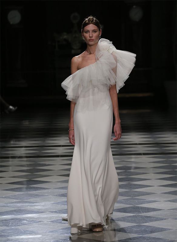 No nos referimos al palabra de honor, sinó más bien a aquellas novias a las que les encanta enseñar clavícula y hombros porque saben que es su punto fuerte. Son novias que acostumbran a tener la piel morena y tersa, que no descartan las mangas o la asimetría, que quieren disimular escote y enseñar hombro les parece sexy sin pasarse.
