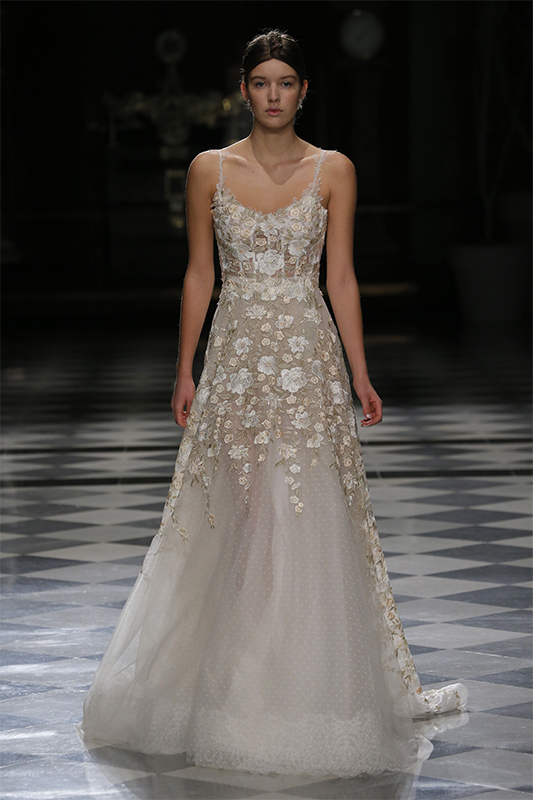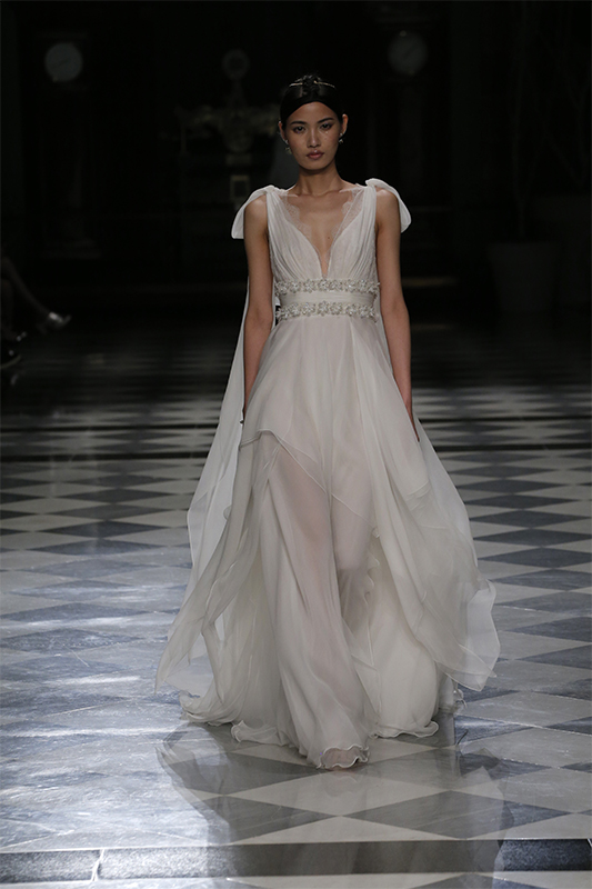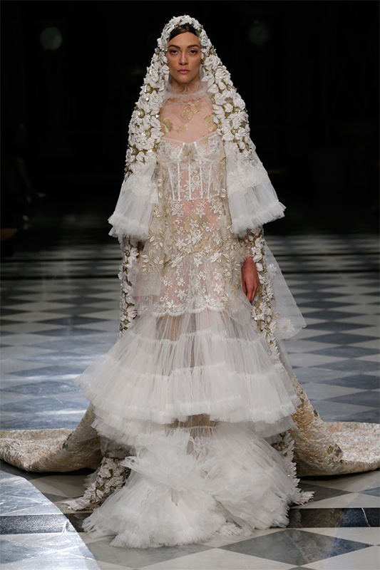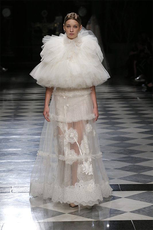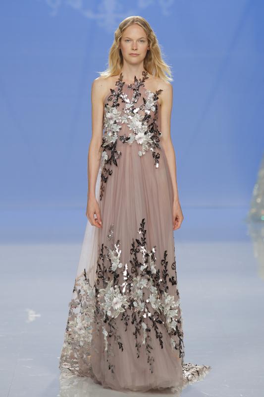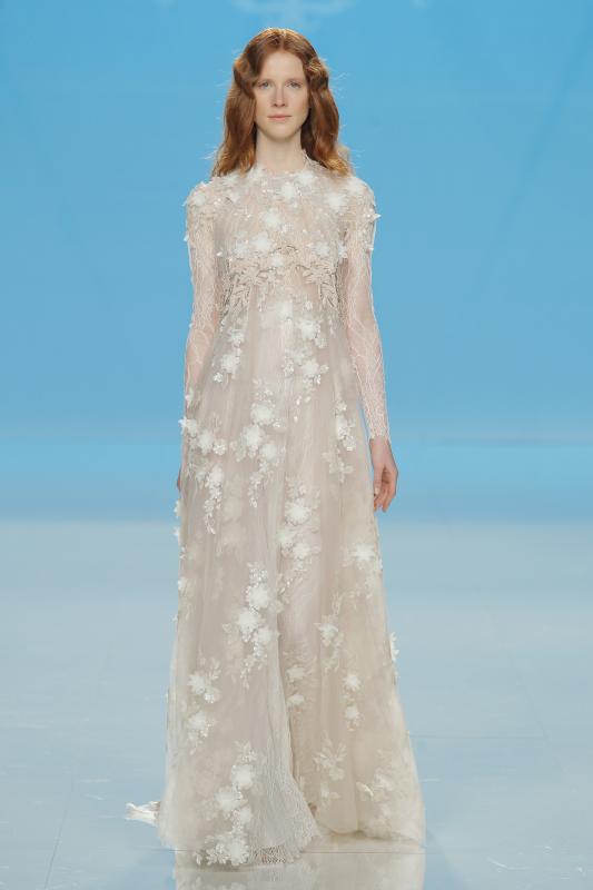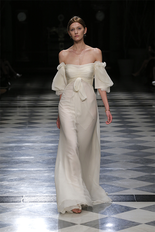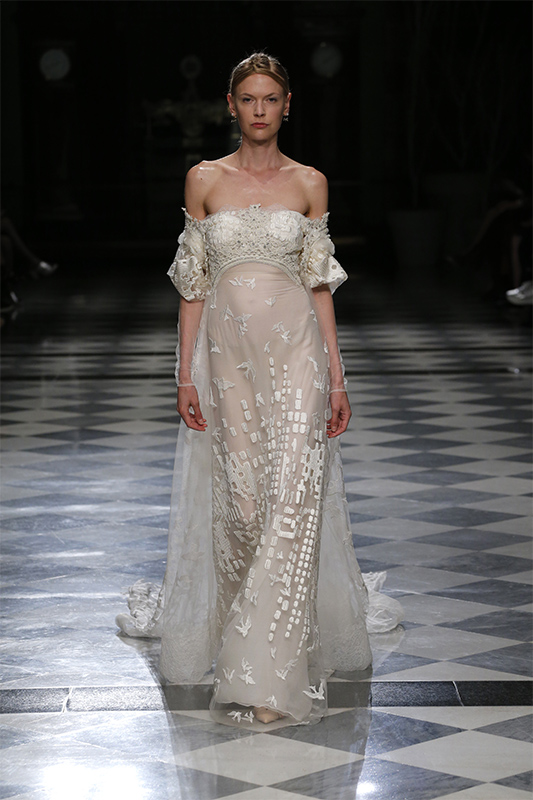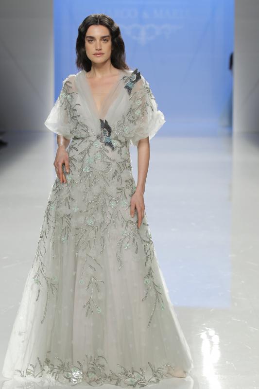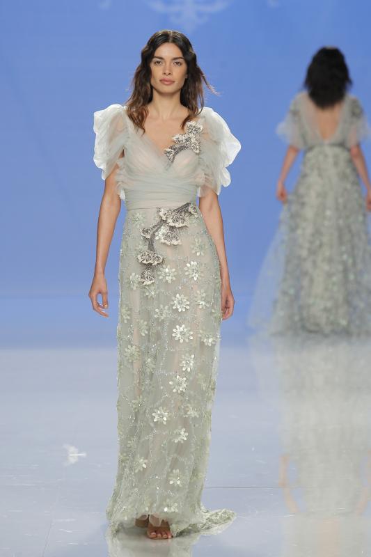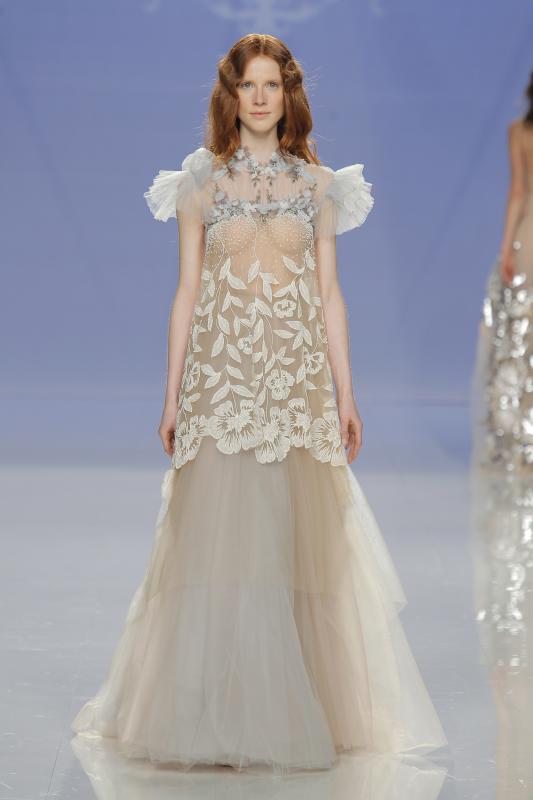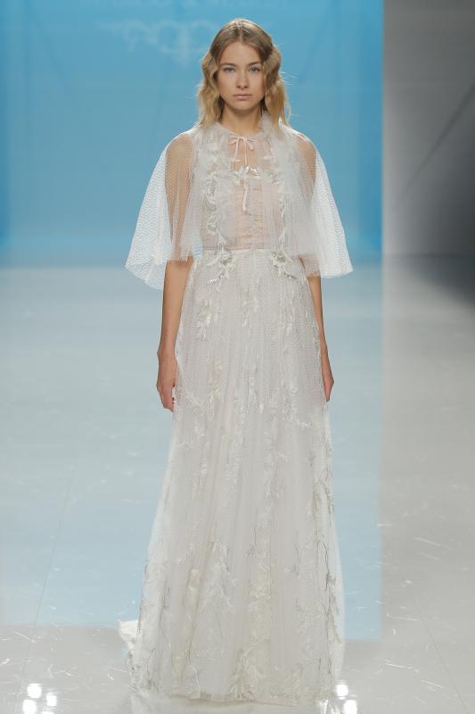 No habíamos oído hablar de ellos (y lo sentimos). Nos metimos en su desfile un poco porque tocaba entre desfile y desfile que sí queríamos ver. Y fue tan grande la ilusión cuando vimos lo que vimos. M&M nos deleitaron con unos vestidos tan delicados, tan románticos, tan de cuento de hadas y ninfas… Para esta colección M&M se inspiraron en el personaje de Ofelia, de la obra shakespeariana Hamlet, y en su amor por la naturaleza y los jardines que crecen a orillas de los lagos y ciénagas de Dinamarca. La visión del personaje ofrecida por los pintores prerrafaelistas del siglo XIX, los colores, la luz, y todos los matices que ellos utilizaron para inmortalizarla en sus lienzos han sido toda una fuente de inspiración. Flores y rocío, tules, organzas y crinolinas, transparencias y colores empolvados, haciendo de cada propuesta un jardín único como aquellos en los que se describía a Ofelia. Enamoradas nos quedamos. ¡Enhorabuena!