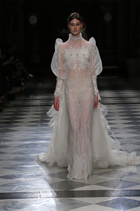 De YolanCris conocíamos su faceta más transgresora y boho, hace años nos enamoramos de su colección «Orquídea» para 2016 (ver aquí) y desde entonces las seguimos de cerca. Lo que no nos podíamos imaginar era que su primera colección de alta costura, celebración de sus 12 años vistiendo a novias, nos dejaría boquiabiertas. Un desfile digno de París. La localización, la Casa Llotja de Mar, fue de ensueño. La música, que hacía que las modelos andásen por la pasarela más lentas que de costumbre, un acierto. ¡Estaban tan cerca que casi las podíamos tocar! Un sinfín de vestidos inspirados en el estilo neo-victoriano, a cual mejor. Desde estampados florales hasta detalles tales como bordados dorados, pedrería y siluetas de inspiración lencera. Cuellos altos y mangas confeccionadas con volantes revelando el cariz más romántico de un estilo caracterizado por la pomposidad, feminidad y extrema atención a la riqueza de las fibras. Su lema: «No hay arte sin artesanía», ¡y se notaba tanto todo el trabajo que había detrás! Nos encantó que al final saliesen ambas diseñadoras acompañadas de las costureras que son realmente las verdaderas maestras de la aguja y nunca se les reconoce su trabajo. ¡Ole, ole y ole!