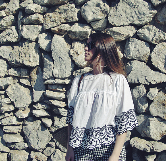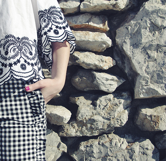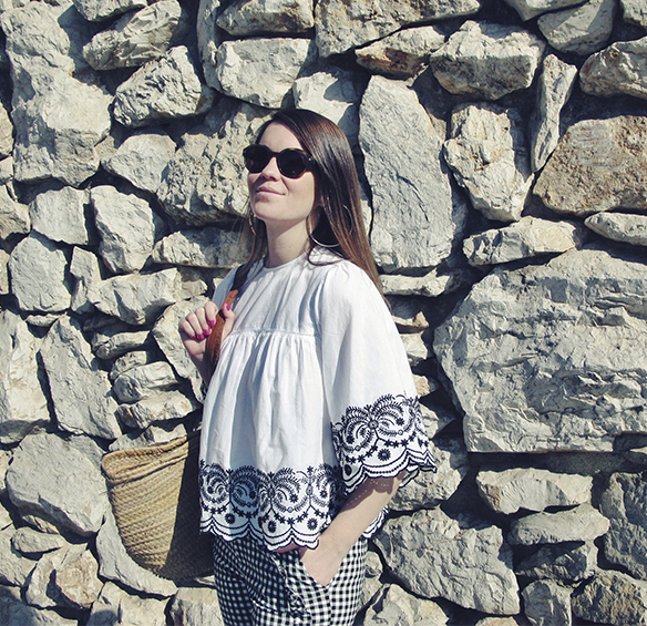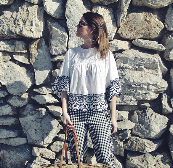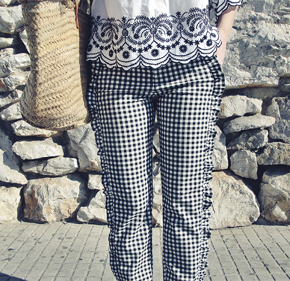 Apostar por un look en black & white siempre será un acierto. Es increíble la potencia que tienen estos dos colores contrapuestos. Yo soy muy de B&W, debo confesarlo. Y hoy os lo traigo en un outfit que desprende veranito 100% con el estampado veraniego por antonomasia, el estampado vichy. Estos pantalones han sido una de las ventas top de Zara esta temporada, y me gustan por el toque de los volantes a los lados que le dan un aire más chic. Me gusta la lucha entre lo chic y lo campestre. El campestre de la blusa y del capazo como si fuésemos de picnic, con el chic de la réplica low cost de los míticos zapatos slingback de Coco Chanel.