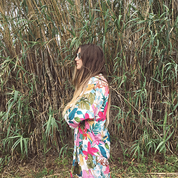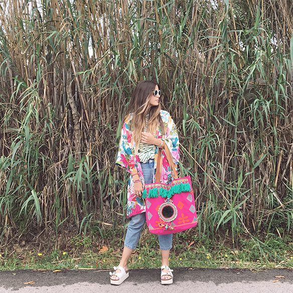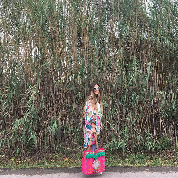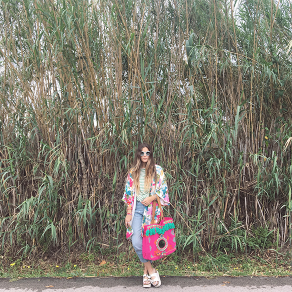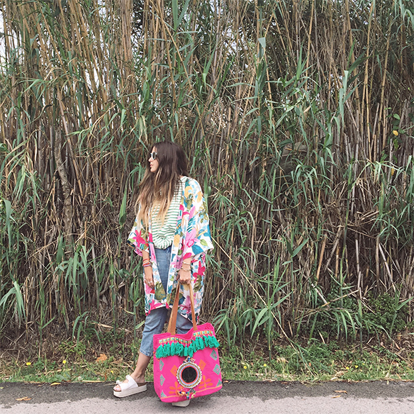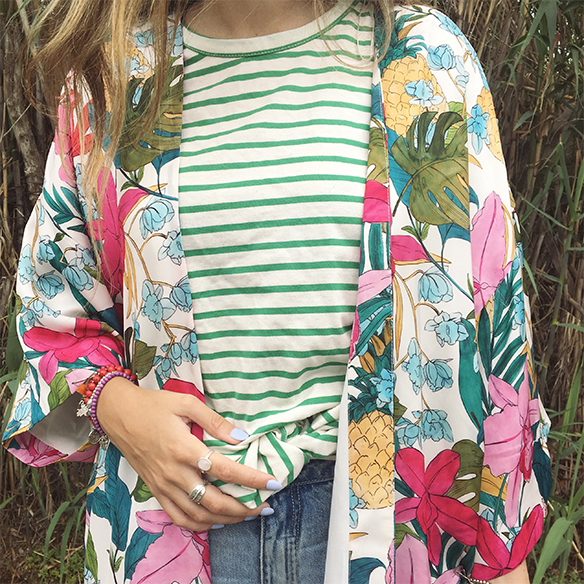Cañas de bambú para un kimono tropical. Rayas verdes con fucsias, jeans cómodos y verano. A veces querrías transportarte a una playa desierta entre palmeras, arena y mar… Y quizás, vestirte con estos tonos y prints se acerca un poquito más a ese bonito sueño. Es una forma de desconectar despierta o soñar con los ojos abiertos, ¿verdad? Sigamos soñando.