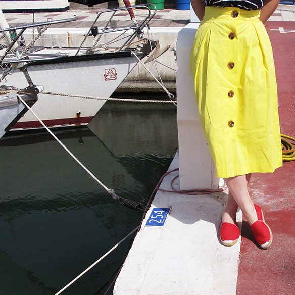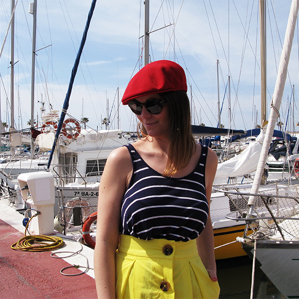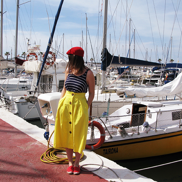 Yellow is trendY. We already know that it is a little complicated color for those who are not very dark skin, but it brings joy! So I did not hesitate for a second when I saw this high-waisted buttoned skirt. I am fond of the sea and I love the sailor outfits. Yellow, although it may not seem like it, is one of the 3 marine colors par excellence: blue, red and yellow. Strolling between boats and sailboats with my new yellow skirt, striped top in blue, and I close the look with the red of espadrilles and beret. I am sure that this summer you will see me a lot with this sailor outfit! Do you have any yellow garments?