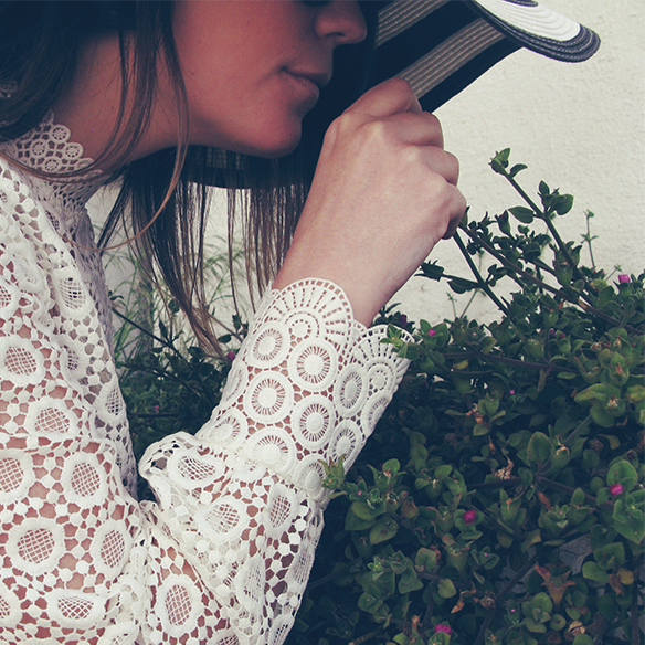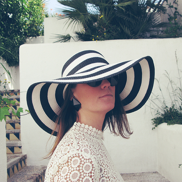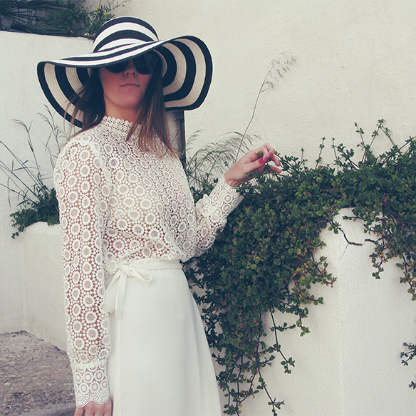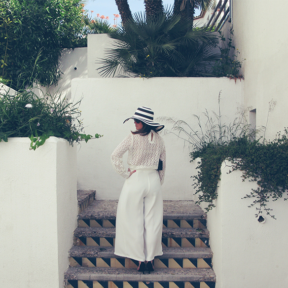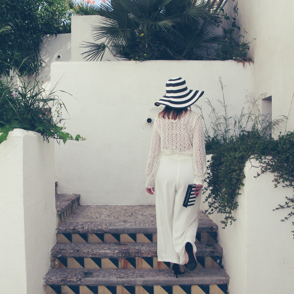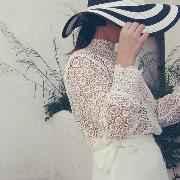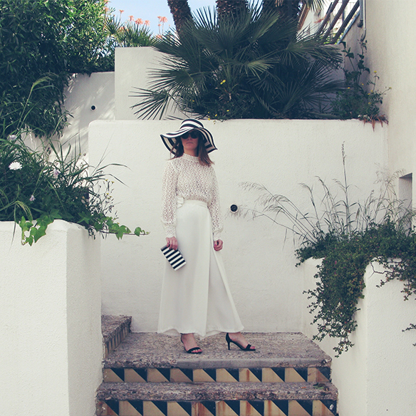 La mayoría de veces que pensamos en looks para San Juan lo hacemos para la noche de la verbena, cuando algunos tenemos comidas el día después. Por eso hoy os traigo un outfit que creo que sería ideal para cualquier comida veraniega que sea un poco más formal, o incluso para una ocasión especial como un bautizo o comunión. Tras celebrar la verbena con un outfit mucho más casual y probablemente descalza en la playa, para el día siguiente propongo calzarse unos tacones de aguja y lucir la vaporosidad de una falda-pantalón en un total white look. Como blusa, escojo ésta de encaje que me tiene enamorada. Creo que a pesar de tener transparencias, si la llevas con un bralette discreto en color carne debajo no queda nada vulgar. El toque final de todo el conjunto son sin duda mis pendientes cuadrados, la pamela (que ya me visteis aquí y aquí) y el clutch, ambos en rayas blancas y negras. ¿Qué os parece mi propuesta para San Juan?