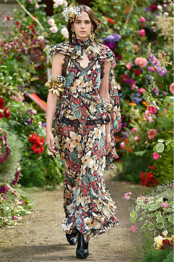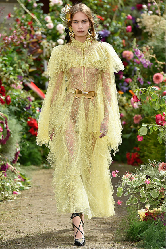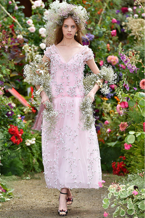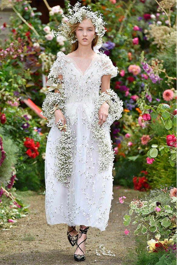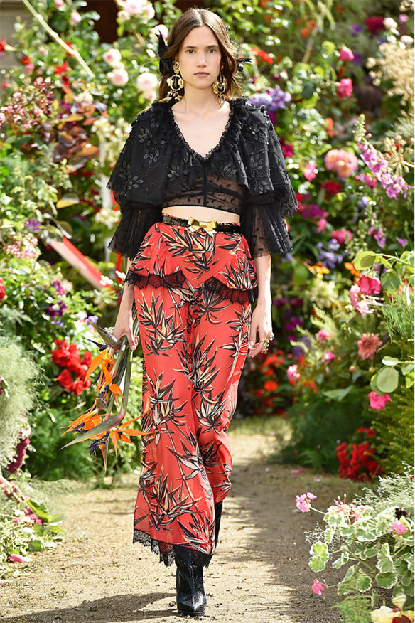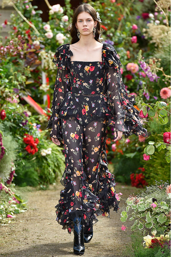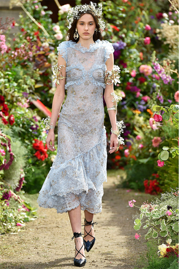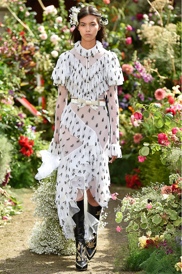 Tejidos ligeros, tonos pastel, transparencias, encajes, volantes, cuellos victorianos y mangas abullonadas se pierden entre estampados florales a cuál más exquisito. Y todo ello mezclado con detalles tan deliciosos como pendientes XL en clave barroca, el nail art o los lazos más kirsch, atrevidas botas de cowboy o el exceso de paniculata -¡nos chifla esta flor!- en coronas de pelo, brazaletes e incluso chales a modo de ramos extra largos. Detalles que sorprendían incluso a un front row tan experimentado como la mismísima Suzy Menkes. Y es que al final del desfile, Rodarte tuvo el detallazo de dejar a las modelos cuál flores del mismísimo jardín e invitó a los asistentes a acercarse para admirar los detalles de sus creaciones de cerca.