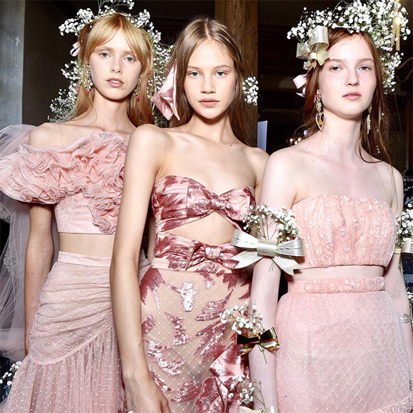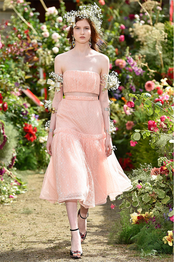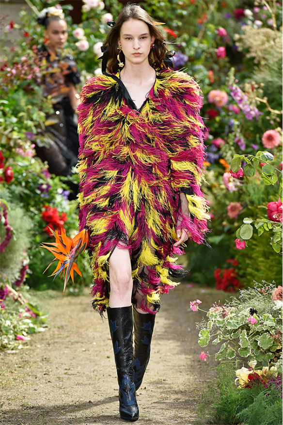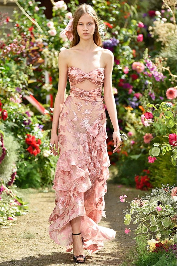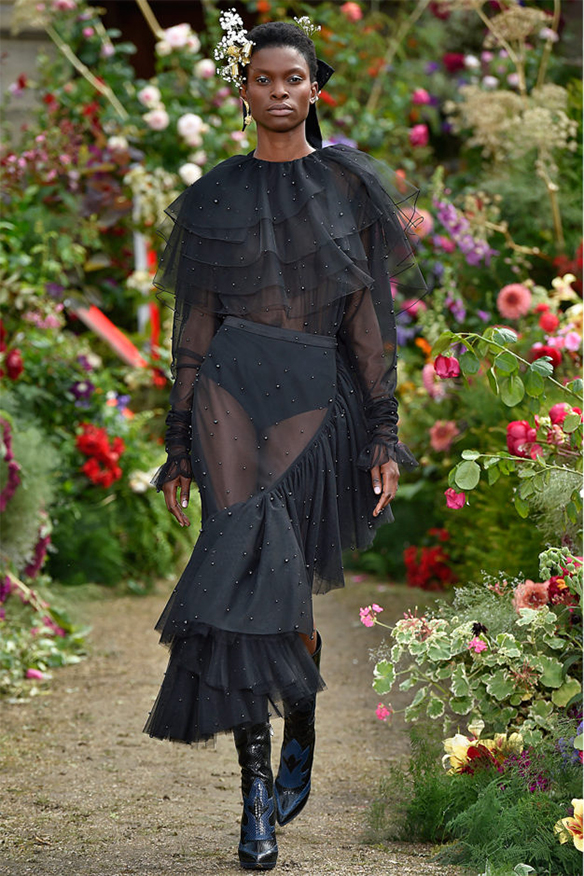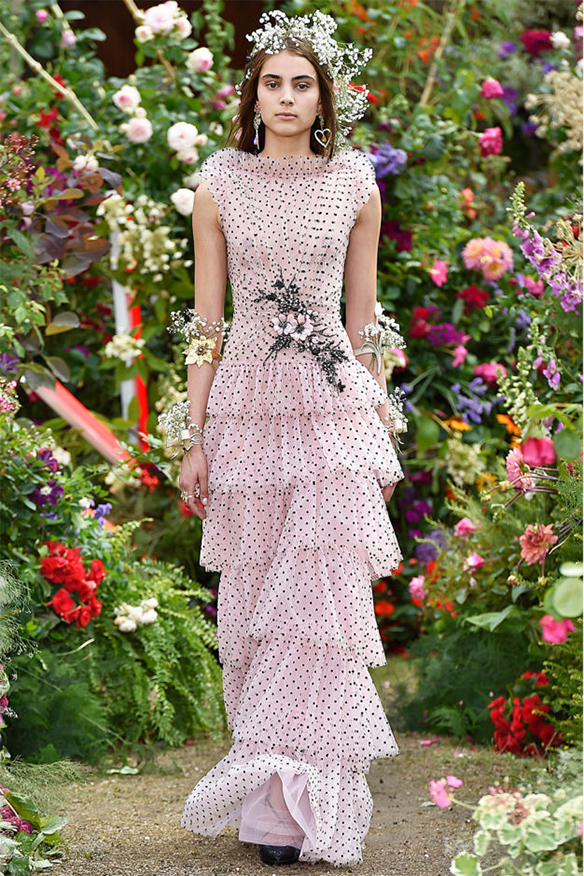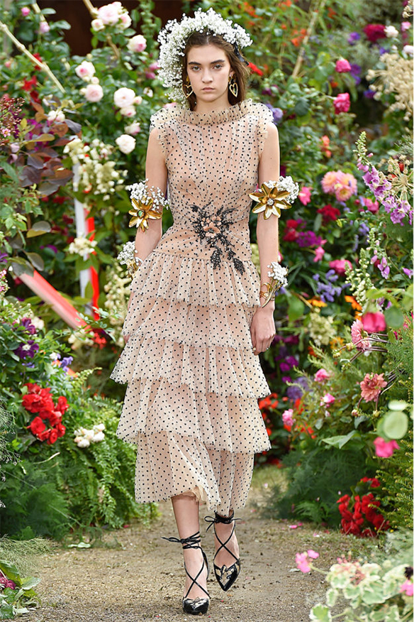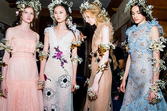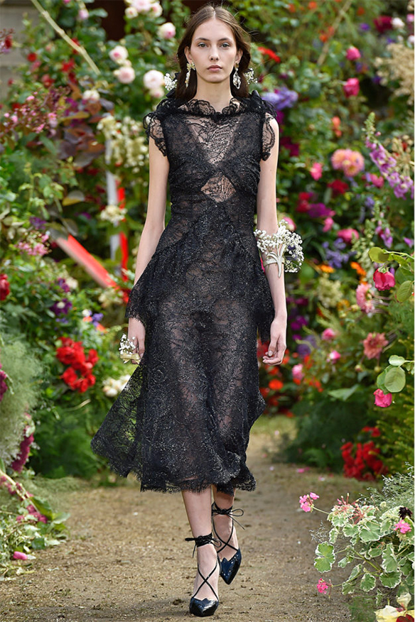 Tejidos ligeros, tonos pastel, transparencias, encajes, volantes, cuellos victorianos y mangas abullonadas se pierden entre estampados florales a cuál más exquisito. Y todo ello mezclado con detalles tan deliciosos como pendientes XL en clave barroca, el nail art o los lazos más kirsch, atrevidas botas de cowboy o el exceso de paniculata -¡nos chifla esta flor!- en coronas de pelo, brazaletes e incluso chales a modo de ramos extra largos. Detalles que sorprendían incluso a un front row tan experimentado como la mismísima Suzy Menkes. Y es que al final del desfile, Rodarte tuvo el detallazo de dejar a las modelos cuál flores del mismísimo jardín e invitó a los asistentes a acercarse para admirar los detalles de sus creaciones de cerca.