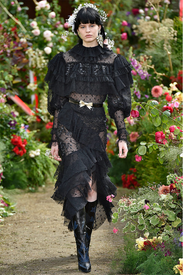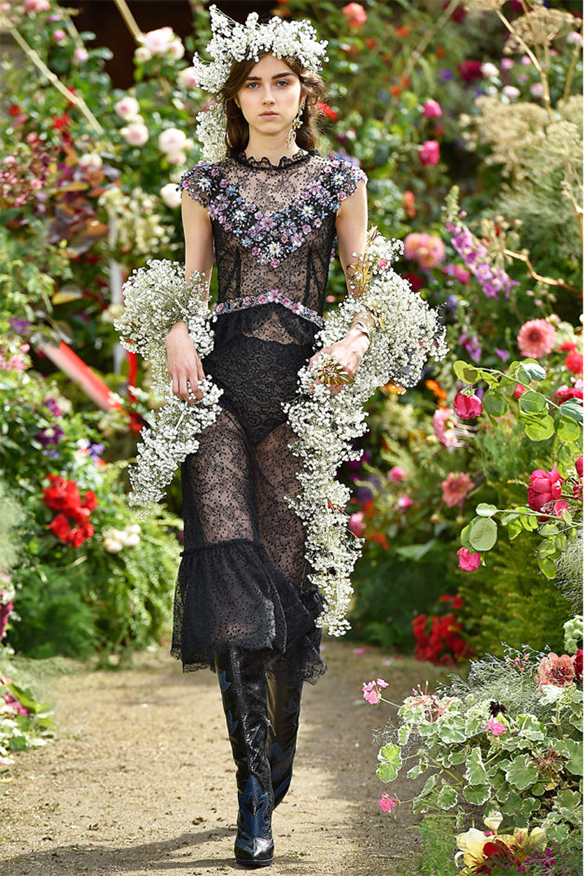 Light fabrics, pastel colors, transparencies, lace, ruffles, Victorian collars and puffed sleeves get lost amongst floral prints to which more exquisite. And all of this mixed with such delicious details as XL baroque earrings, kirsch nail art, daring cowboy boots or paniculata excess -we love this flower!- in hair wreaths bracelets and even shawls as extra long bouquets. Details that surprised even a front row as experienced as the very Suzy Menkes. And at the end of the fashion show, Rodarte had the great idea of leaving the models as flowers of the garden and invited the attendees to approach to admire the details of their creations up close.