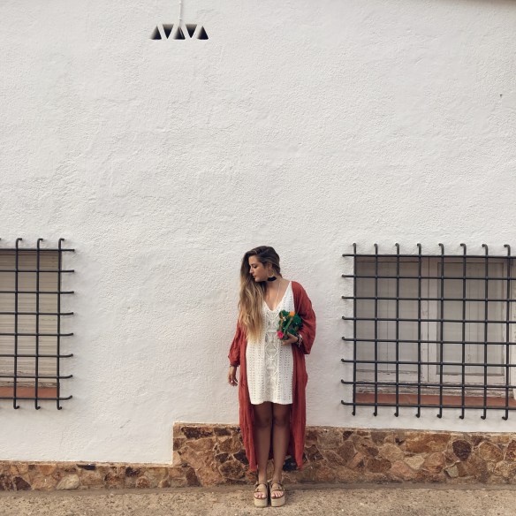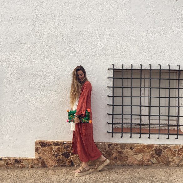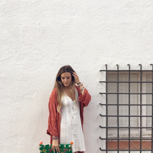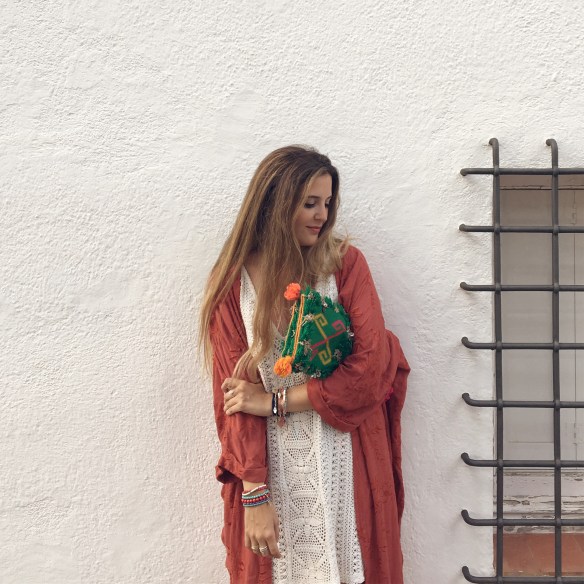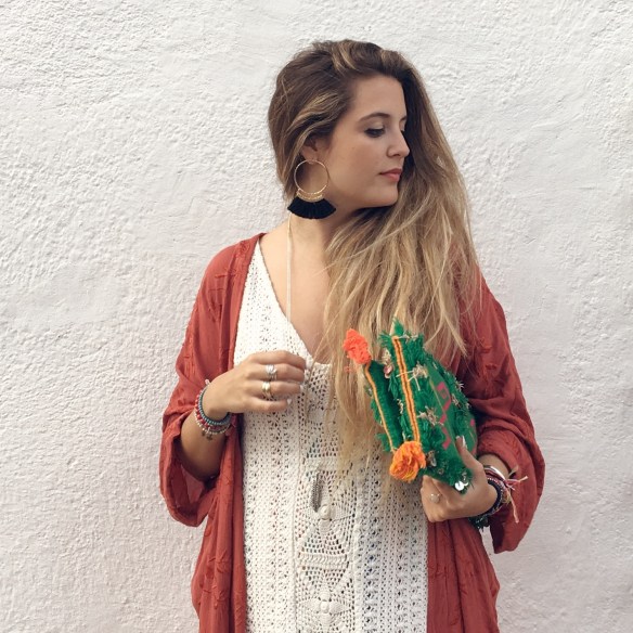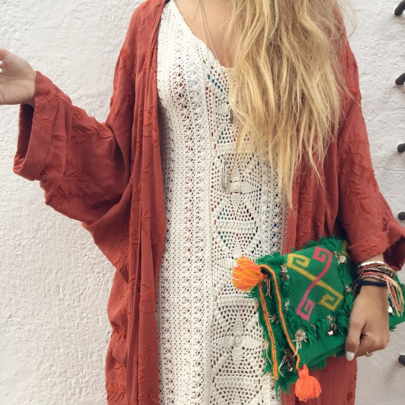Vestit de ganxet i kaftan llarg fins als peus, sandàlies d’espart i bossa ètnica com les maxi arrecades és el look que defineix aquest rotllo boho que et captiva en les nits de vacances en els últims moments de l’estiu. Aprofites els últims dies de sol i mar, les últimes nits de soparets i copes fins tard, les ultimes tardes de xerrades entre amics que mai acaben i els plans sense horaris… Feliços últims dies!