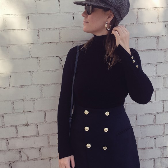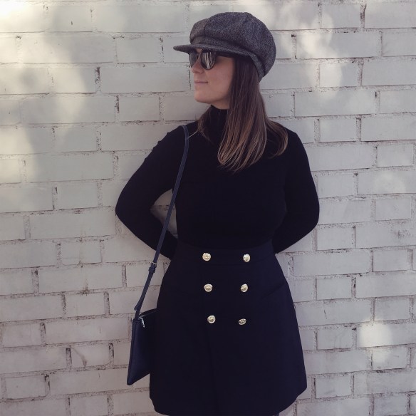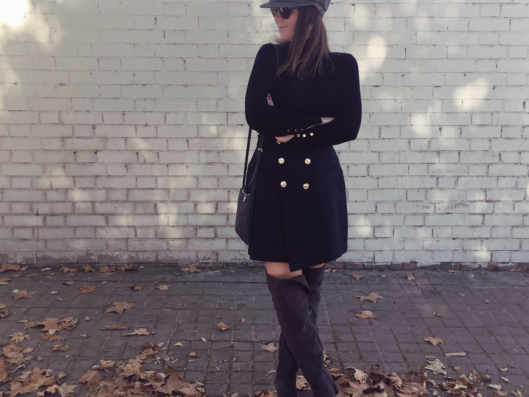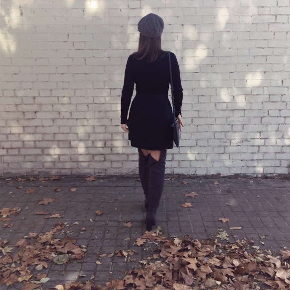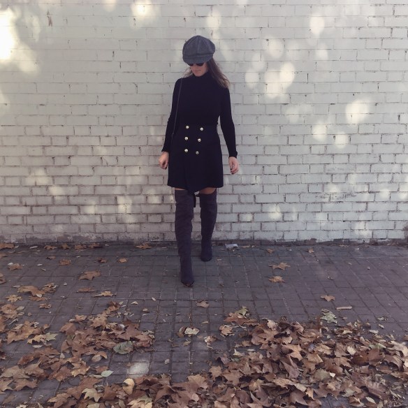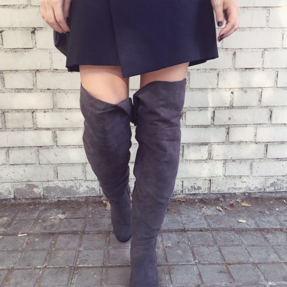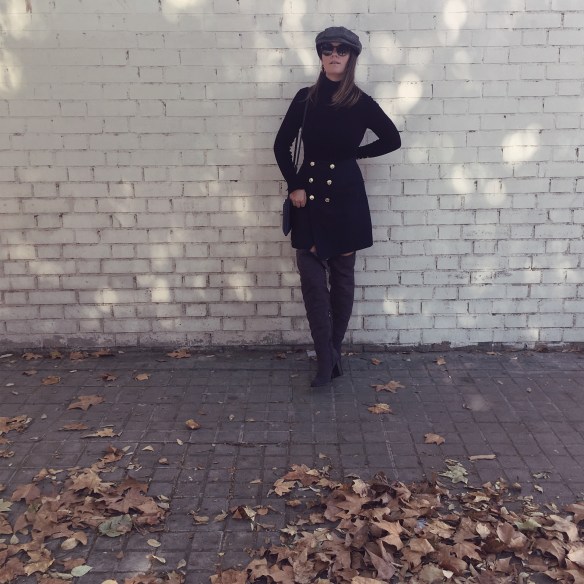 The boots that go over the knees are trendy. I like to match these grey ones with a total look in navy blue composed of a buttoned parer-skirt and a turtleneck jumper. I close the look with a grey baker boy cap, blue handbag, and the touch of the earrings that are golden hoops, that match the buttons of both skirt and jumper. Do you dare with over the knee boots?