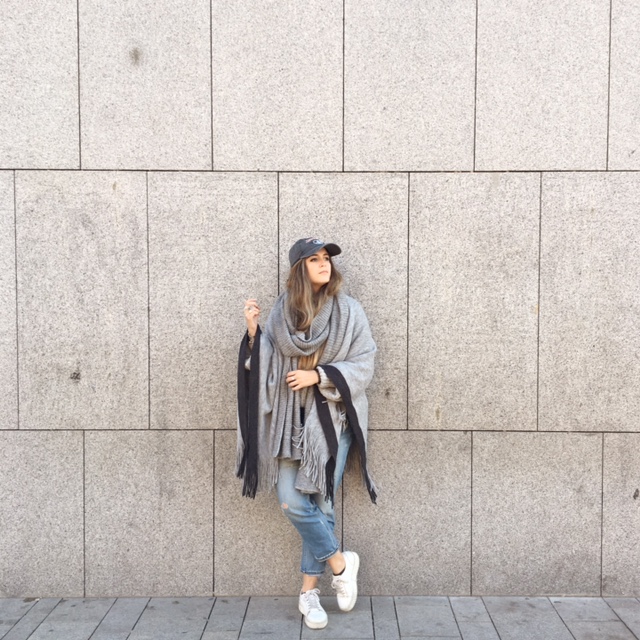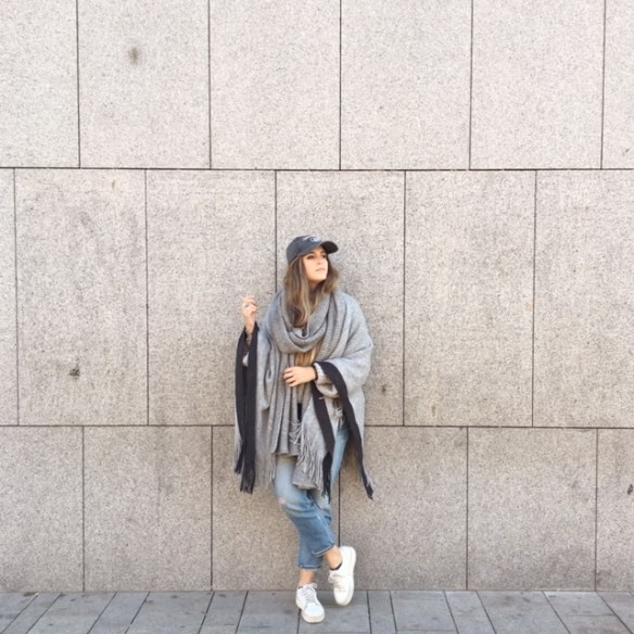 A veces los extremos no son buenos y otras veces son geniales. Yo hoy me siento defendiendo el lema «ni blanco ni negro, gris». ¡Viva el gris para los días de sol en invierno! Para esos días que el abrigo sobra, me alío con la «manta» de lana -en realidad poncho/capa-, maxi bufanda del mismo tono y siguiendo la gama de colores protagonista gorra grabada por los rayos de sol invernales. Me gustan los colores neutros para momentos lazy, y es que muchas veces mis looks acompañan mi estado de ánimo… ¿Te ocurre lo mismo?