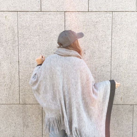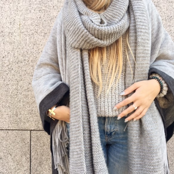 Sometimes extremes are not good and other times they’re great. Today I feel defending the motto «neither white nor black, grey». Long live grey for the sunny days in winter! For those days that the coat is not necessary yet, I go for the wool «blanket» -in reality cape/poncho-, maxi scarf of the same tone and following the range of colors a cap engraved with winter sunbeams. I like neutral colors for lazy moments, as many times my looks accompany my mood… Does the same thing happen to you?