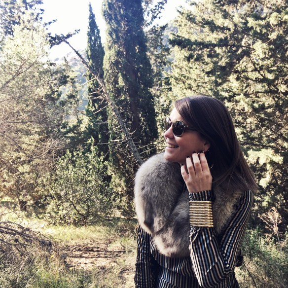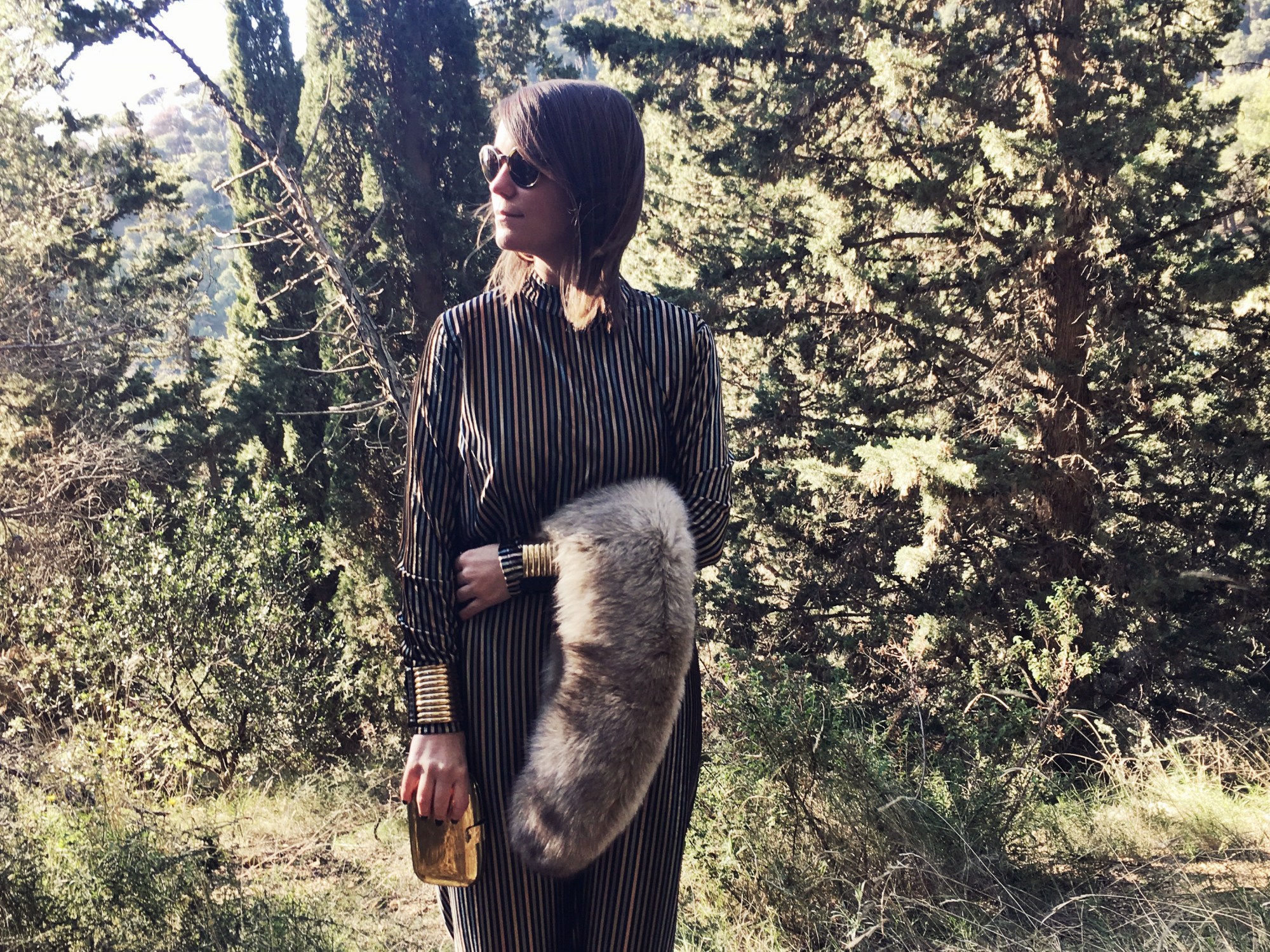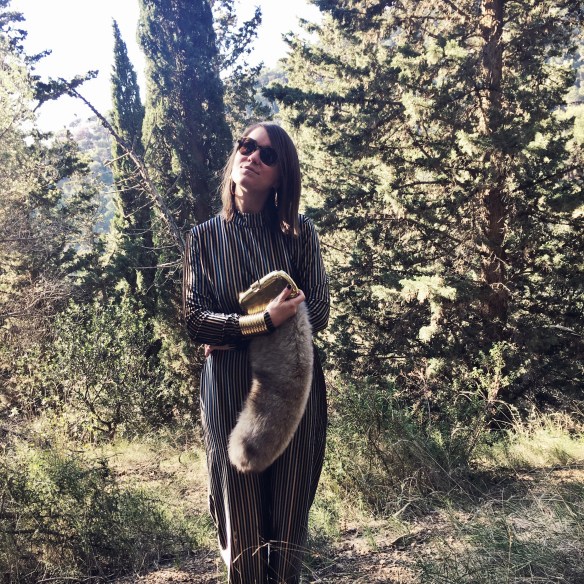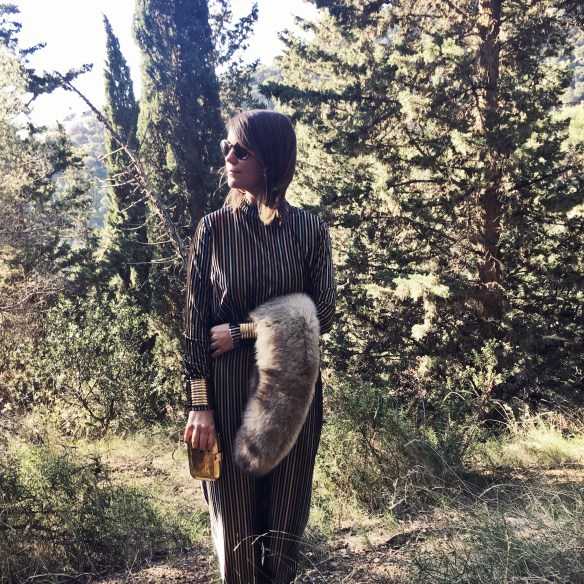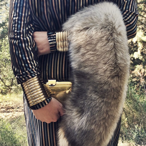 Christmas Eve arrives and with it the dreaded: What can I wear? This year I propose to leave aside the topical and typical black or red classic dresses, to bet on a «retro» two piece. I match this set of top and trousers in golden velvet stripes, with a fur stole and accessories such as the clutch, the hoops and the African bracelets in gold. What do you think about this retro touch for Christmas Eve? Merry Christmas!
