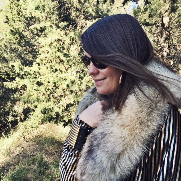 Llega la Nochebuena y con ella el temido: ¿Qué me pongo? Este año yo propongo salir de los tópicos y típicos vestidos clásicos negros o rojos, para apostar por un dos piezas algo «retro». Combino este conjunto de top y pantalón en rayas doradas de terciopelo, con una estola de pelo y los complementos como el clutch, los aros y las pulseras africanas en dorado. ¿Qué os parece este toque retro para nochebuena? ¡Feliz Navidad!