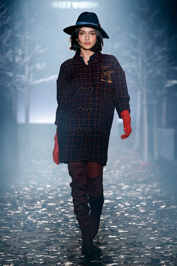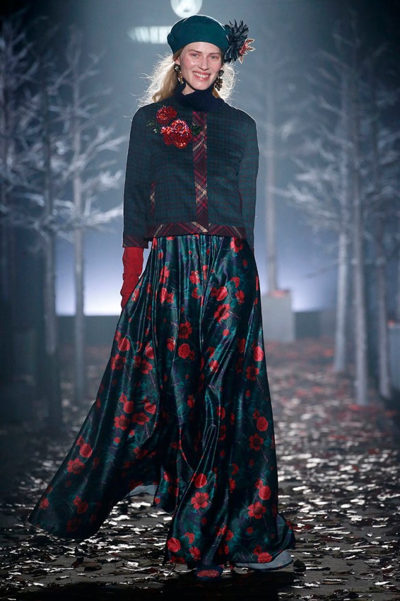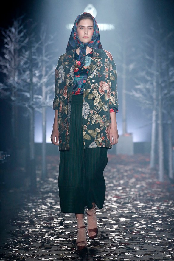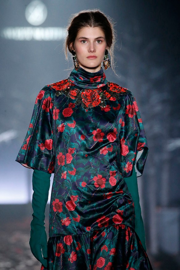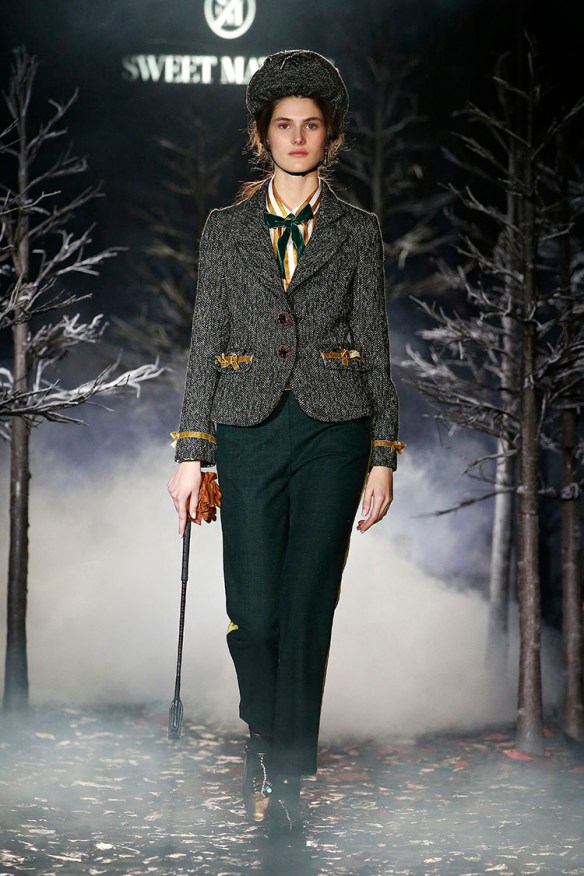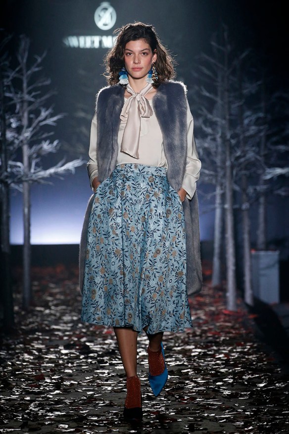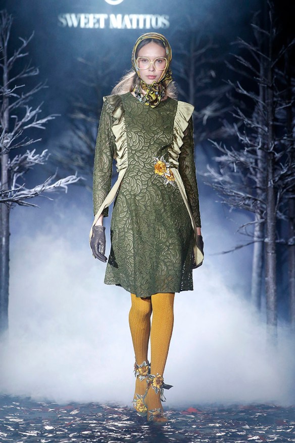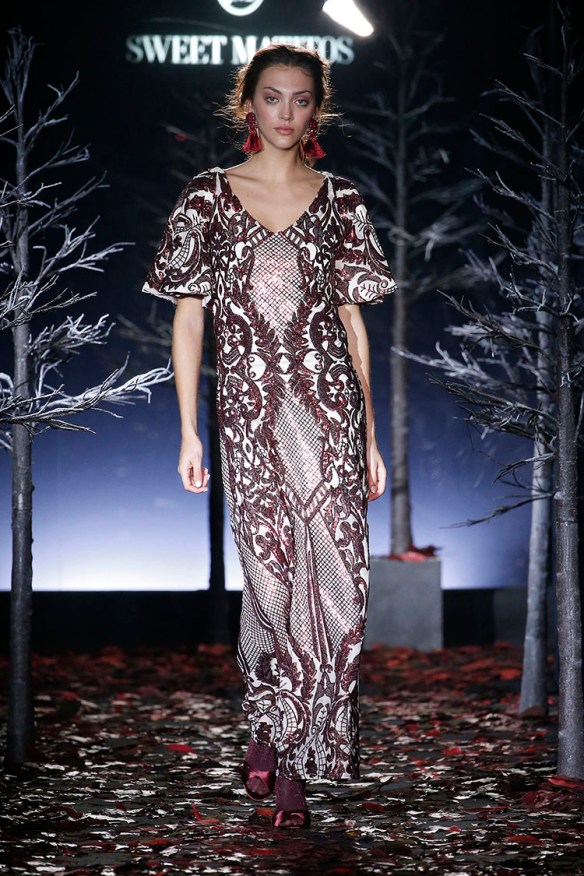 Exageración y lujo de detalles. Sweet Matitos nos trae excesos hasta en la puesta en escena, cosa que nos encanta porque el ambiente es también súper importante en un desfile. Por eso le damos el top number 1 a la colección Winter Ball Season de Matías Jaramillo y Tito Maristany, por apostar por el todo. Empiezan sonando unas gaitas, envueltas de niebla, árboles y hojas en la pasarela; que dan paso a una mujer con clase, auténtica, femenina, sensible, libre y amante del lujo. En esta época del año y como viene siendo tradición, comienza la temporada de bailes, y la mujer Sweet Matitos se retira a su casa en el campo. Una mujer sofisticada y elegante que pasea por el bosque de su jardín amando esa naturaleza. Naturaleza que queda plasmada en las prendas que luce con estampados y flores invernales sobre tejidos de espiga, de paño, en texturas esponjosas, todo en colores otoñales como rojizos, verdes, dorados y grises; y con el lema «more is less» en complementos. Pañuelos, perlas, pendientes xl, lazos, plumas, guantes, sombreros, boinas o turbantes adornan a la mujer Sweet Matitos de una forma sublime. No es de extrañar que ni la mismísima Naty Abascal no quisiera perderse su desfile. ¡Enhorabuena chicos, nos chifla!