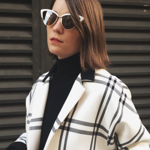 ¡Fue ver estas gafas de sol cat eye blancas y transportarme a los años 60! Ya sabéis que los outfits en blanco y negro me vuelven loca. Sobre la base de un total look negro con el jersey de cuello alto y mis pantalones de vinilo, combino los slingbacks de estilo Chanel y una chaqueta bicolor que me parece lo más ahora que se acerca la primavera y empieza a apetecer vestir con colores más claros. ¡Espero que os guste mi rollo 60s!