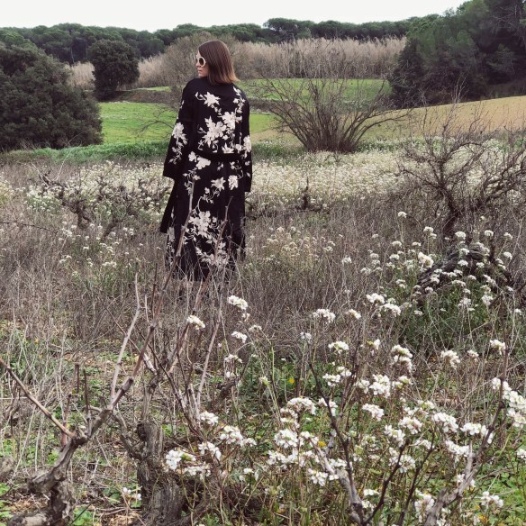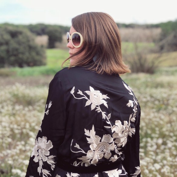 Las flores son mi debilidad. De cualquier tipo, pero cuanto más silvestres y sin artificios cuando van en un ramo, mejor. Me emociono cuando voy conduciendo por la carretera y veo que ya han florecido los almendros. Es como que sé que en nada llega la primavera y con ella empieza el buen tiempo. Y cuando pienso en florecer, me viene a la mente Japón, sus cerezos en flor y como plasman tan delicadamente los estampados de flores en sus prendas de ropa. Por eso hoy doy la bienvenida a la primavera con este kimono que destaca por encima de un total black look. ¡Flores, floreced con ganas!
