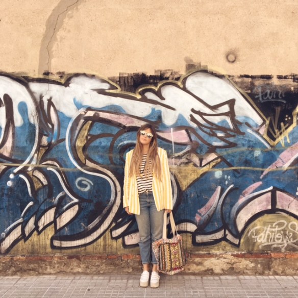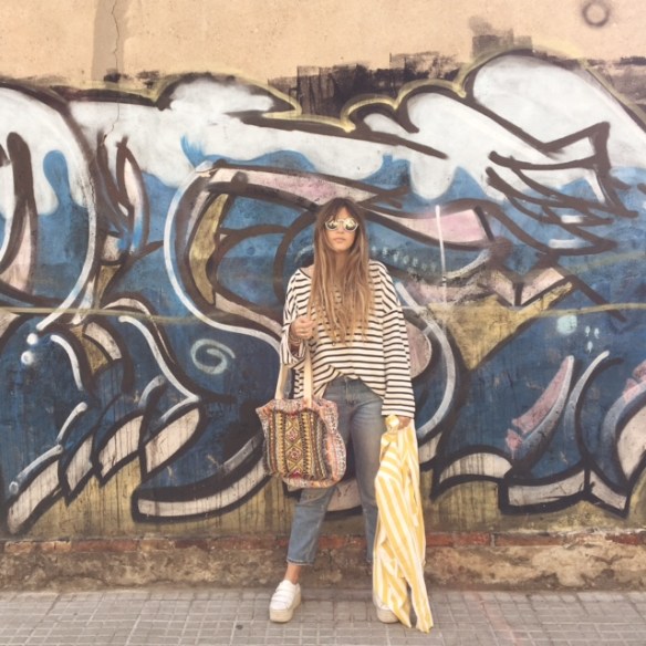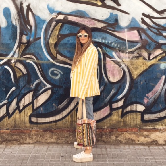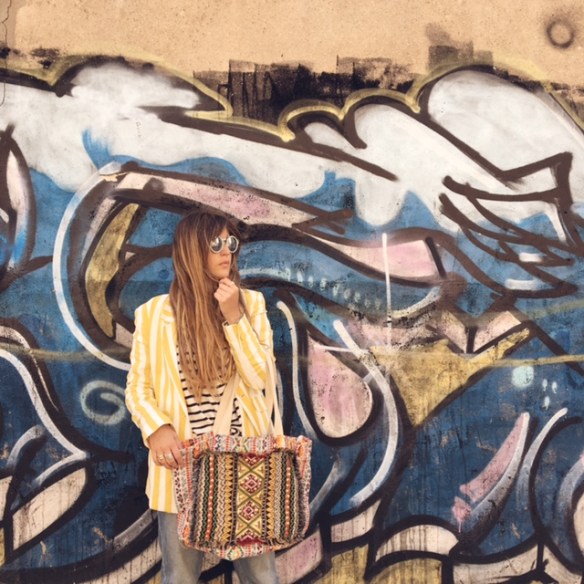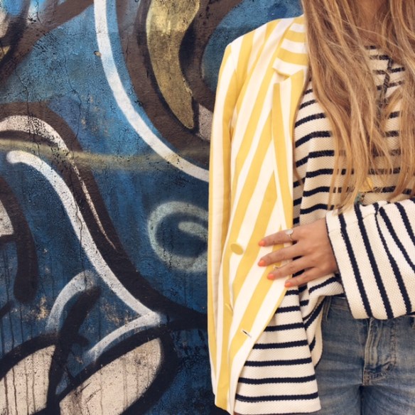 Sinònims de primavera: ulleres de sol, print a ratlles, colors vius, aparició del ethnic print, fora mitjons, llum, al·lèrgia, frescor, rialles. La primavera la sang altera. Dies de blazer, jeans semi llargs i jerseis de cotó. El meu look és la combinació de tot això: uns boyfriend jeans amples, combinats amb el jersei i el blazer en mix & matx de ratlles: les clàssiques marineres amb un xut d’energia estrident del groc. Maxi bossa boho, ulleres de sol blau claret i ungles en taronja. Visca el color bloc en els dies de sol! I els teus sinònims de primavera?