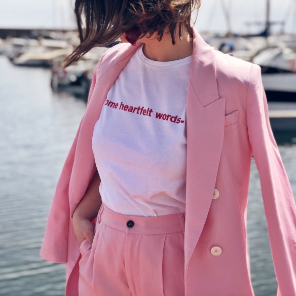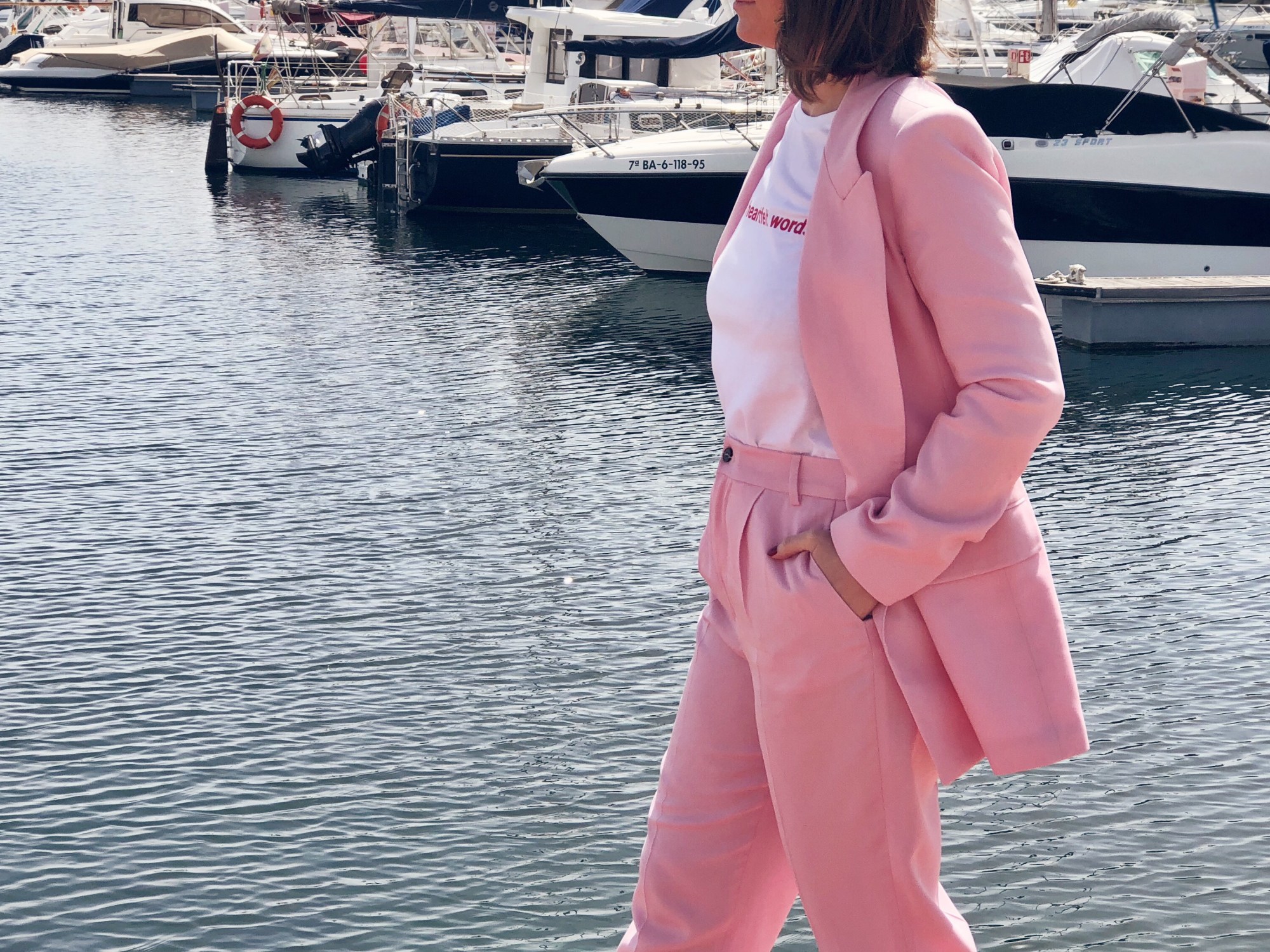 Never say never… And you’ll tell me: I already told you. So yes, because here I am with all my «nevers»: a pink suit, with a white shirt with red message on it, polarized sunglasses and I match everything in a sporty key with trainers. Never say never!