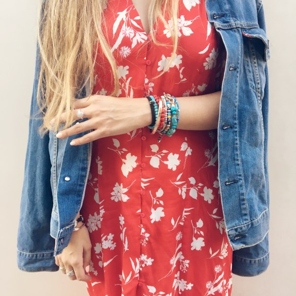 Creo que llegados a junio, todos necesitamos salidas de emergencias, esas de escaparse y desconectar. De no pasar calor o disfrutar del mismo bajo el sol y el agua. Salida de emergencia es un nuevo capítulo de un libro, una peli con el móvil desconectado, una cena con una sobremesa hasta la madrugada sin saber que hora es… Salida de emergencia es un vestido vaporoso durante el día porque mueres de calor y llevar en el maxi bolso una cazadora tejana (la mejor opción para junio) para cuando de repente hace frío. Por eso esta opción: vestido rojo en floral print abotonado hasta las rodillas y bambas. ¿Puede existir combinación mejor para este mes?