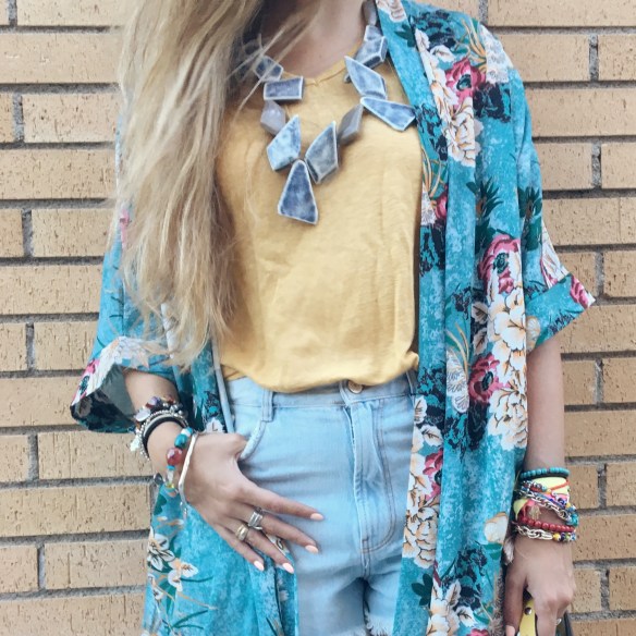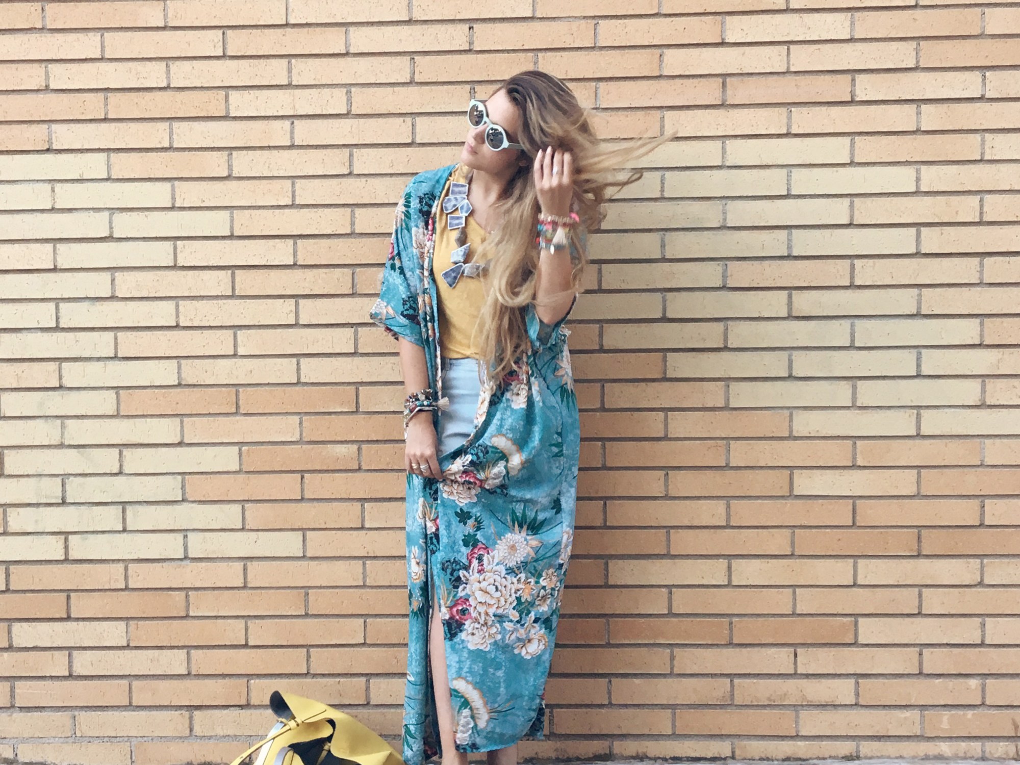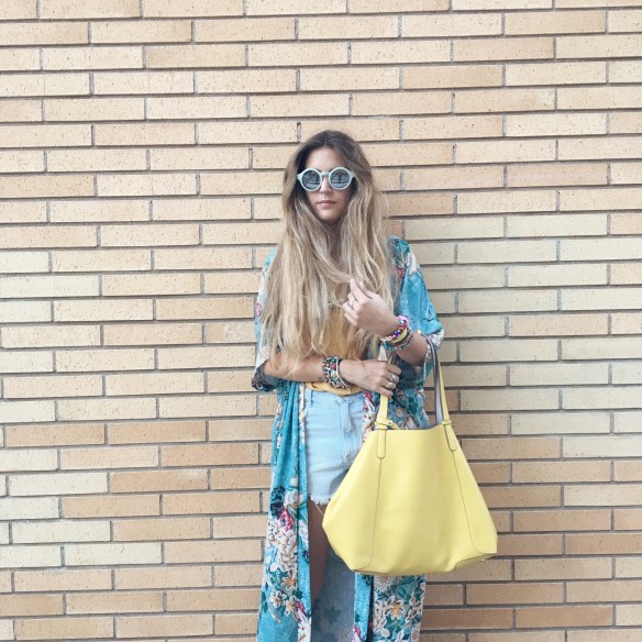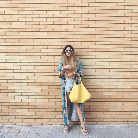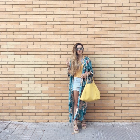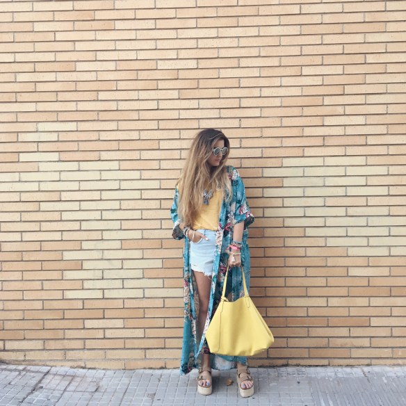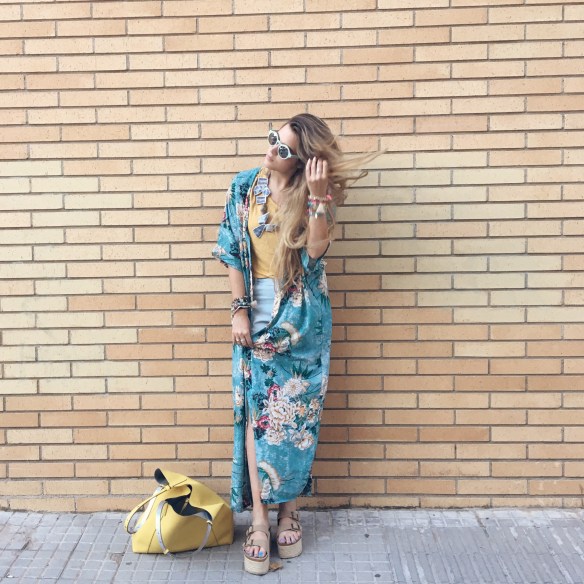 In summer, as in every season, I have my essentials: flip flops, iced tea, cool nightgown, pretty scrunchies, sunglasses, an off-road book… The best sensation? The fullness that gives me swiming in the sea, rolling in the sand, relaxing with its blue and its sounds, I am a girl of the sea. Best moment? The sunset, with its sweet and romantic light, like a watercolor in pastel colors. Fetish garments? First the long dresses, and second: the kaftans, for me, they transform the looks. As in this case: from a basic look of shorts & linen t-shirt, it gives a different roll, it gives color, fun with its print, dynamism for being XL when creating movement, femininity… They’re never missing in my closet in Summer! And your essentials?