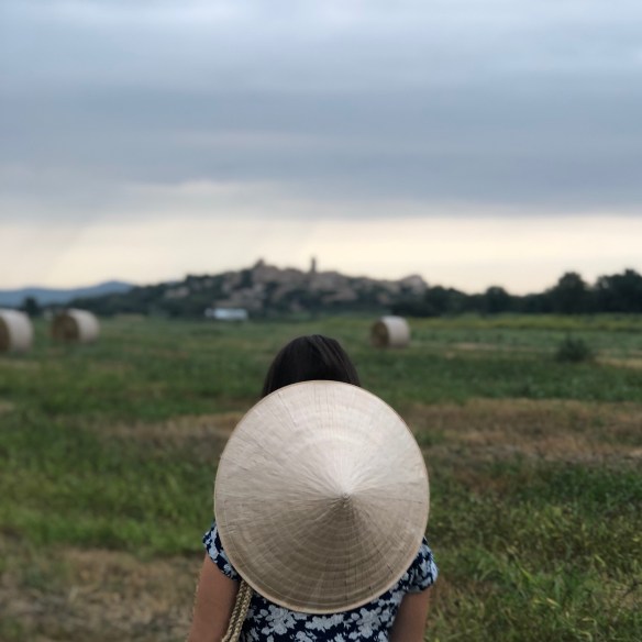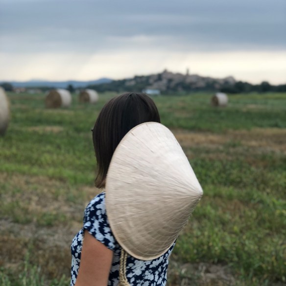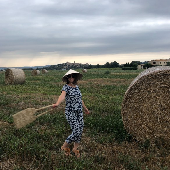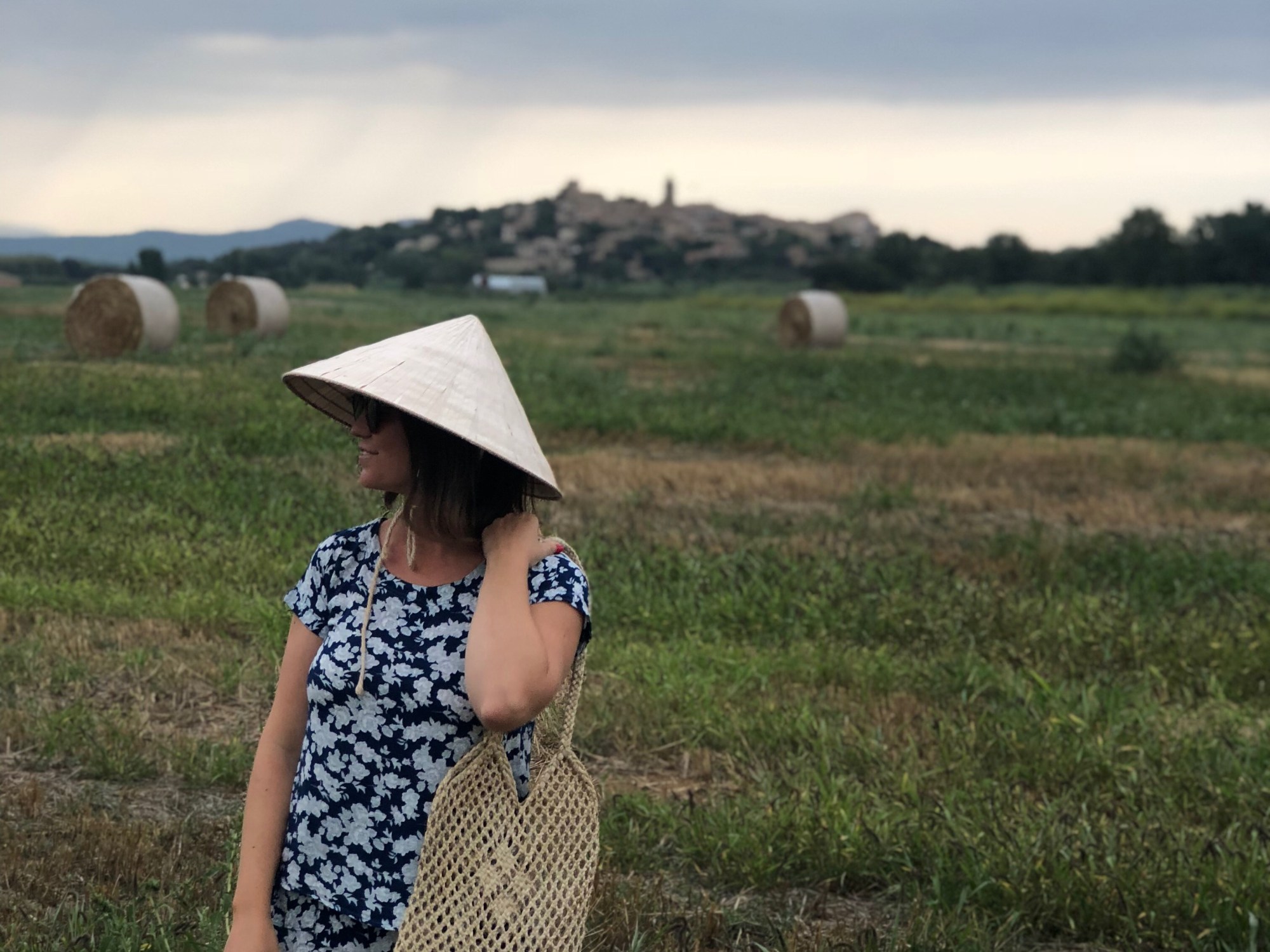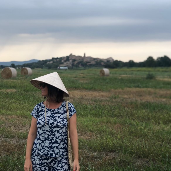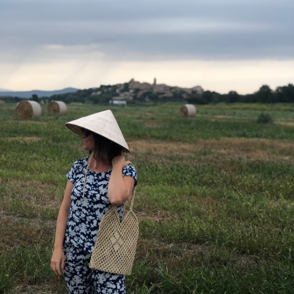 When I travel I like to bring back something from there, something authentic that they use there, not a mere souvenir. And this is what happened to me with today’s total look. The majority of Vietnamese peasants dress in the same print (twin set style) cotton t-shirt and pants, very simple, that may even look like pyjamas, but that seem to me the most. I found one with navy blue and grey floral print and said, I take it! I don’t know how do I look like with this Vietnamese set taking pics as a peasant from Pals in l’Empordà, but I do not care: I am from the world. And as I love to wear garments of the world, I match it with a beautiful handmade handbag made in Cambodia, and the mythical Vietnamese hat of which you know that I am a fan. What do you think of my Vietnamese country version?